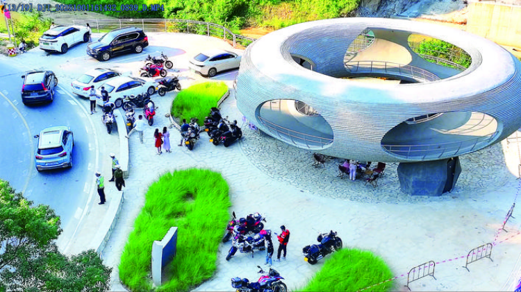 218最美旅游公路沿途设置的艺术装置,既是网红打卡点,也是游人休憩的好去处。在博罗段中,绿屏石滩艺术装置尤为吸睛。直径16.5米的观景环凌空悬于峭壁边缘,下沉广场与漂浮平台构成的双层标高景框,恰好将山水风光框成一幅流动的画,成为游客定格美景的绝佳选择。休憩区里,摩旅爱好者与骑行爱好者围坐闲谈,手捧特色豆花拿铁,你一言我一语分享着沿途所见的秀丽风光。“一路风景绝了!各个驿站和艺术装置的间距特别合理,骑累了就坐下喝杯咖啡、看看山景,这种边骑边玩的惬意,是其他路线比不了的。”骑行爱好者邓先生赞不绝口。他说,骑行群里常有人分享这条公路的美景与攻略,趁着国庆假期,他立刻约上好友来一场深度体验。罗浮山茶、东坡茶乐事等本地特色饮品,刚推出就成了游客争先品尝的“爆款”。