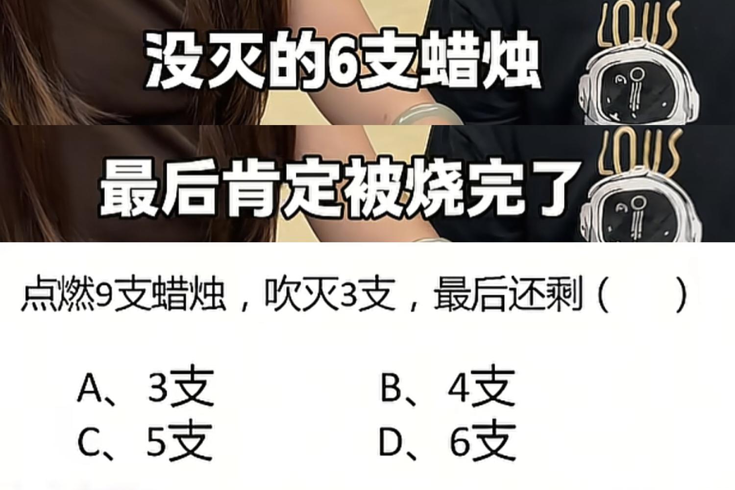 这道题目的问题很简单:“点燃9支蜡烛,吹灭3支,最后还剩几支?”这是一道选择题,答案有4个选项,分别是:A.3支;B.4支;C.5支;D.6支,而小学生给出的答案是A.3支。