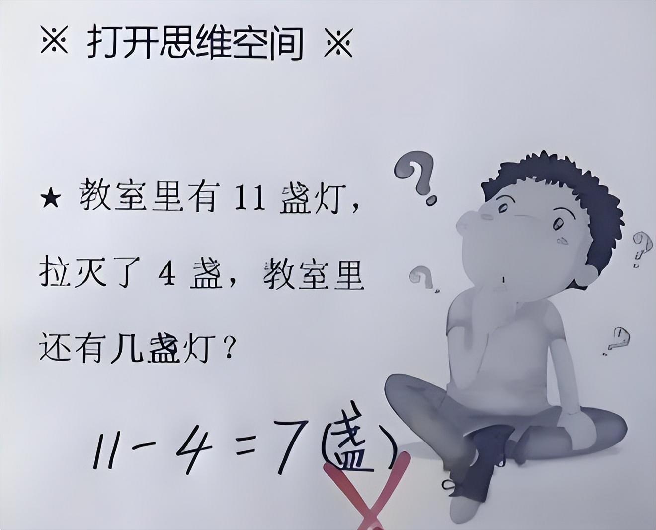 而这道题如果只按照数学思维去处理的话,答案应是11-4=6,而如果仔细思考一下,就会意识到,即使把教室里的4盏灯拉灭,那4盏灯也依旧存在,因此正确的解题思路和那位妈妈第二次的思路是一样的。