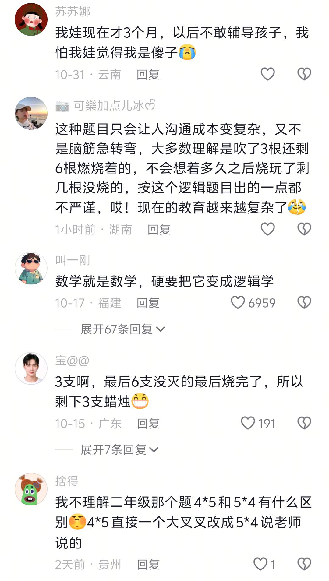 围观了母子俩关于作业的修罗场,这位爸爸终于看不下去了,直言:这是思维题,你仔细想想,吹灭3支蜡烛点金网,而没被吹灭的3支蜡烛最后肯定被烧完了,那到底剩几支,答案不是很明显吗?